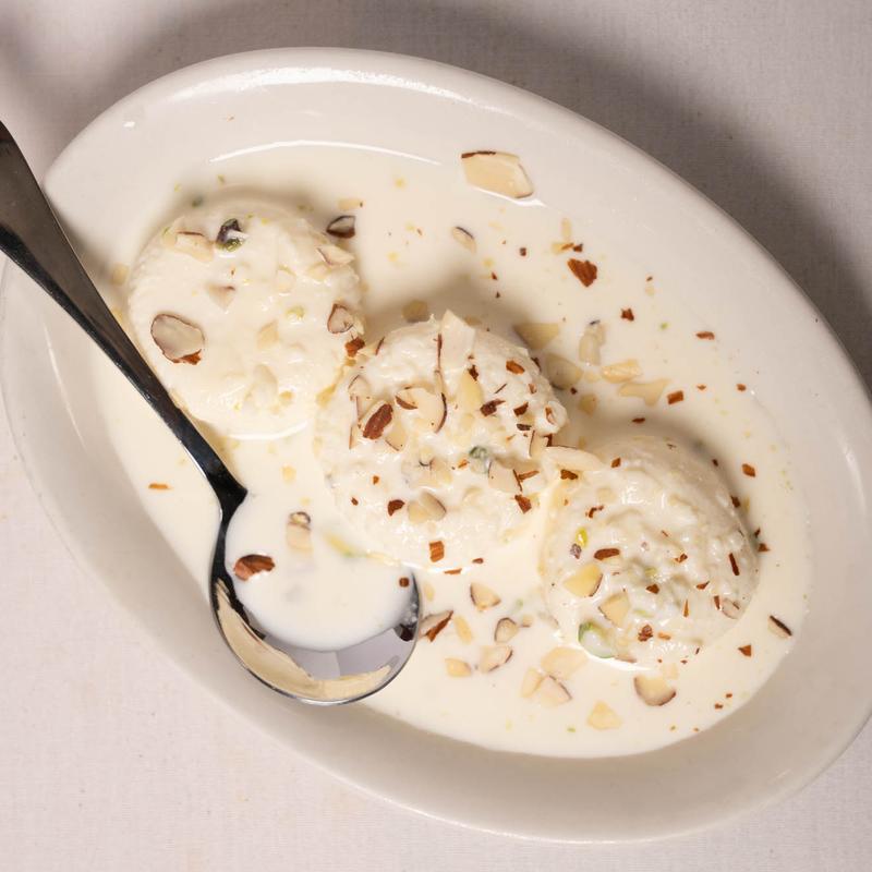 Homemade cheese patties immersed in milk & flavored with cardamom, topped with grated pistachios.